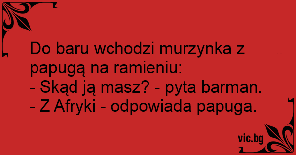 Egy néger fickó sétál be egy bárba, vállán egy nagy papagájjal. A pultos meglepődve felkiált: - Hát ezt meg honnan szerezted?! Mire megszólal a papagáj: - Afrikából, ott több millió van belőle!
