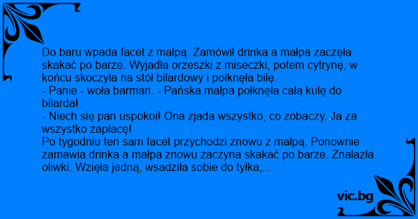 Po tygodniu ten sam facet przychodzi znowu z małpą. Ponownie zamawia drinka a małpa znowu zaczyna skakać po barze. Znalazła oliwki. Wzięła jedną, wsadziła sobie do tyłka, a potem zjadła.