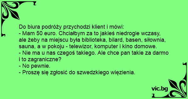 - Mam 50 euro. Chciałbym za to jakieś niedrogie wczasy, ale żeby na miejscu była biblioteka, bilard, basen, siłownia, sauna, a w pokoju - telewizor, komputer i kino domowe.