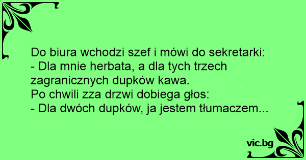 Директорот носи во канцеларија тројца странци, и ја вика секретарката: - Направи кафе за овие тројца педери! Еден од нив се јавува: - Двајца педери! Јас сум само преведувач...