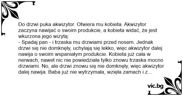 - Spadaj pan - i trzaska mu drzwiami przed nosem. Jednak drzwi się nie domknęły, uchylają się lekko, więc akwizytor dalej nawija o swoim wspaniałym produkcie. Kobieta już cała w nerwach, nawet nic nie powiedziała tylko znowu trzaska mocno drzwiami. No, ale drzwi znowu się nie domknęły, więc akwizytor dalej nawija. Baba już nie wytrzymała, wzięła zamach i z całej siły trzasnęła drzwiami. Jednak drzwi znowu się nie domykają, a akwizytor pokazując w dół mówi: