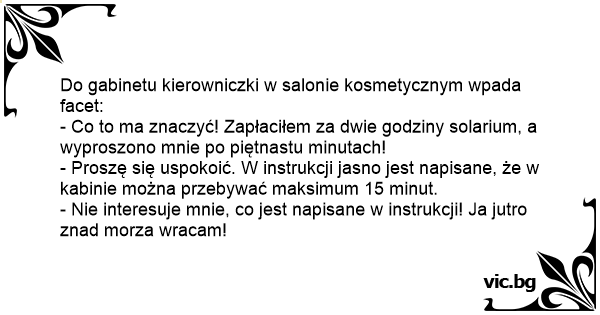 - Co to ma znaczyć! Zapłaciłem za dwie godziny solarium, a wyproszono mnie po piętnastu minutach!