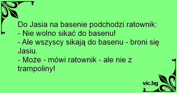 - Mężczyzna w żółtych slipkach ma natychmiast opuścić teren pływalni - wrzeszczy ratownik. - A dlaczego mam wyjść? - Bo pan sika. - Wszyscy to robią. - Ale tylko pan z trampoliny.