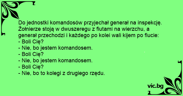Do jednostki komandosów przyjechał generał na inspekcję. Żołnierze stoją w dwuszeregu z fiutami na wierzchu, a generał przechodzi i każdego po kolei wali kijem po fiucie: