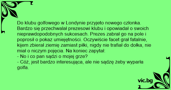 Do klubu golfowego w Londynie przyjeto nowego członka. Bardzo się przechwalał prezesowi klubu i opowiadał o swoich nieprawdopodobnych sukcesach. Prezes zabrał go na pole i poprosił o pokaz umiejętności. Oczywiście facet grał fatalnie, kijem zbierał ziemię zamiast piłki, nigdy nie trafiał do dołka, nie miał o niczym pojęcia. Na koniec zapytał: