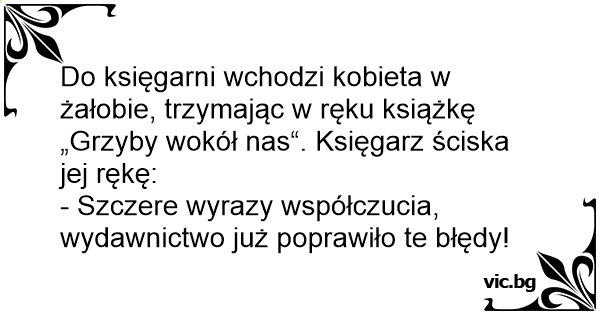 Do księgarni wchodzi kobieta w żałobie, trzymając w ręku książkę „Grzyby wokół nas“. Księgarz ściska jej rękę: