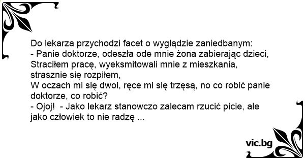 - Ojoj! - Jako lekarz stanowczo zalecam rzucić picie, ale jako człowiek to nie radzę ...