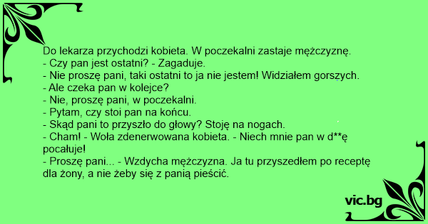 - Proszę pani... - Wzdycha mężczyzna. Ja tu przyszedłem po receptę dla żony, a nie żeby się z panią pieścić.