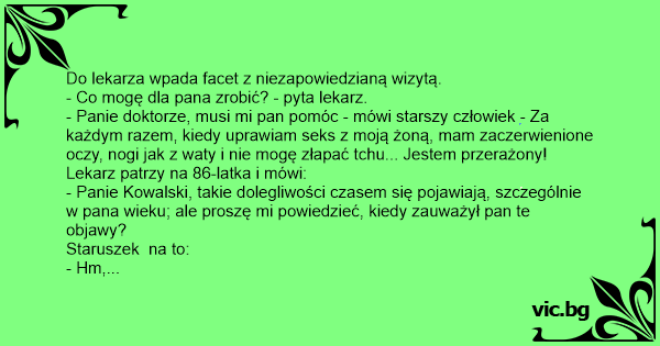 - Panie doktorze, musi mi pan pomóc - mówi starszy człowiek - Za każdym razem, kiedy uprawiam sекs z moją żoną, mam zaczerwienione oczy, nogi jak z waty i nie mogę złapać tchu... Jestem przerażony!