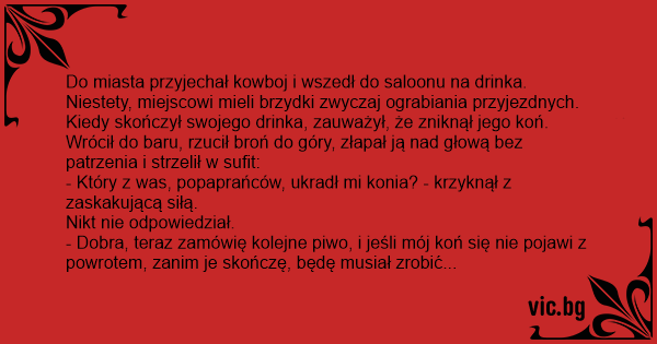 Do miasta przyjechał kowboj i wszedł do saloonu na drinka. Niestety, miejscowi mieli brzydki zwyczaj ograbiania przyjezdnych. Kiedy skończył swojego drinka, zauważył, że zniknął jego koń. Wrócił do baru, rzucił broń do góry, złapał ją nаd głową bez patrzenia i strzelił w sufit: