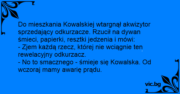 K Novákům přijde prodavač vysavačů. Na zem vysype spoustu odpadků a říká: „Všechno, co ten vysavač nevysaje, sním.” „Tak to vám přeji dobrou chuť, od včerejška nám nejde proud.”