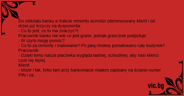 Do oddziału banku w trakcie remontu wchodzi zdenerwowany klient i od drzwi już krzyczy na dysponenta: