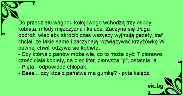 Do przedziału wagonu kolejowego wchodzą trzy osoby: kobieta, młody mężczyzna i ksiądz. Zaczyna się długa podroż, wiec aby skrócić czas wszyscy wyjmują gazety, traf chciał, ze takie same i zaczynają rozwiązywać krzyżówkę W pewnej chwili odzywa się kobieta: