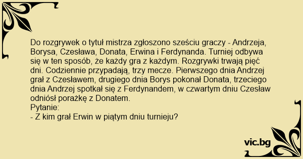 Do rozgrywek o tytuł mistrza zgłoszono sześciu graczy - Andrzeja, Borysa, Czesława, Donata, Erwina i Ferdynanda. Turniej odbywa się w ten sposób, że każdy gra z każdym. Rozgrywki trwają pięć dni. Codziennie przypadają, trzy mecze. Pierwszego dnia Andrzej grał z Czesławem, drugiego dnia Borys pokonał Donata, trzeciego dnia Andrzej spotkał się z Ferdynandem, w czwartym dniu Czesław odniósł porażkę z Donatem.