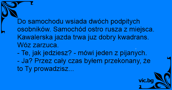 Do samochodu wsiada dwóch podpitych osobników. Samochód ostro rusza z miejsca. Kawalerska jazda trwa juz dobry kwadrans. Wóz zarzuca.