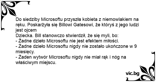 Do siedziby Microsoftu przyszła kobieta z niemowlakiem na ręku. Poskarżyła się Billowi Gatesowi, że któryś z jego ludzi jest ojcem