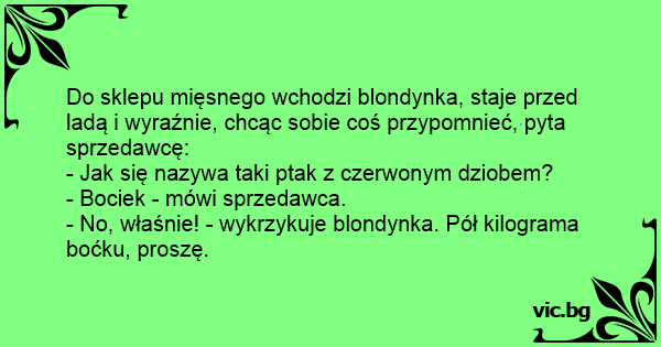 Do sklepu mięsnego wchodzi blondynka, staje przed ladą i wyraźnie, chcąc sobie coś przypomnieć, pyta sprzedawcę: