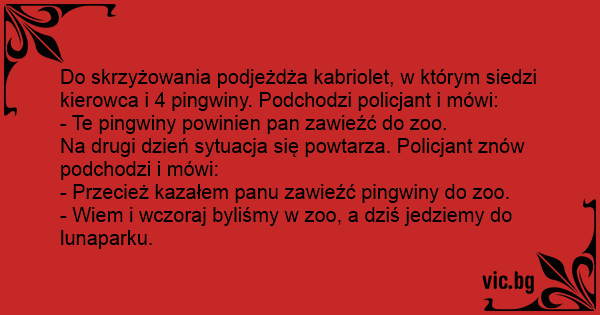 Мајмун Chiste del pingüino y el policia Η ξανθιά και ο πιγκουίνος Един господин намира папагал на улицата. Двама борци намират пингвин. - Bonjour, avez-vous amené au zoo le pingouin que vous avez trouvé dans la rue? Две мутри намират пингвин и звънят на шефа: Kommt ein Mann mit einem gefundenen Schimpansen an der Hand in ein Polizeirevier und will ihn abgeben. Ein Mann ging über die Straße und sah einen Pinguin. Daraufhin ging er zu einem Polizisten und sagte ihm: "Ich habe 'n Pinguin auf der Straße gefunden." Der Polizist antwortete daraufhin: "Bringen Sie Ihn in den Zoo." Der Mann ging am nächsten Tag mit dem Pinguin in den Zoo. Dort traf er den... A man has his car full of penguins. He drives past a policeman, but the policeman stops him. He says: "Hey, you! Yeah, you! You should take those penguins to the zoo!" The man does that. The next day in the same spot, the man still has the penguins. Once again he drives past the policeman.... Ήταν μια ξανθιά και στον δρόμο της είδε έναν παπαγάλο και σκεφτόταν τι να τον κάνει. Έρχεται ένας αστυνόμος και την ρωτάει: -Γιατί είστε εδώ όλη μέρα; -Βρήκα αυτόν τον παπαγάλο και δεν ξέρω τι να τον κάνω. -Να τον πάτε στο ζωολογικό κήπο. -Τέλεια ιδέα! Την επόμενη μέρα ο αστυνόμος βλέπει παλι τον... Μια ξανθιά πάει στο πάρκο και βρίσκει έναν παπαγάλο. Tι να τον κάνω η γυναίκα; (Σκέφτεται. Ίσως για πρώτη φορά στη ζωή της). Εκεί που βασάνιζε το `μυαλό` της, ένας αστυνομικός που περιπολούσε εκεί κοντά, την πλησιάζει και τη ρωτάει: - "Τι συμβαίνει εδώ;" - "Βρήκα έναν παπαγάλο και δεν ξέρω τι... Un carabiniere trova un pinguino per la strada per cui telefona in centrale per chiedere cosa farne. "Portalo allo zoo". Il giorno dopo ritelefona e chiede: "E oggi dove lo porto, al cinema?". A police officer sees a man driving around with a pickup truck full of penguins. He pulls the guy over and says: “You can’t drive around with penguins in this town! Take them to the zoo... En äldre dam hittade en pingvin. Hon visste inte vad hon skulle göra med den, så när hon träffade en polis frågade hon: - Vad ska jag göra av den här pingvinen? - Gå till djurparken med den,... 2 Agenten komen een pinguin tegen op straat. "Wat moeten we daarmee?" zeggen ze tegen elkaar... Ze beslissen uiteindelijk om hem mee te nemen. Onderweg gaan ze tanken en de pompbediende vraagt hen:... Un type se promène avec un crocodile dans Paris. Un policier l'interpelle: - Dites donc vous là, que faites-vous avec ce crocodile ? - Hé bien, je l'ai trouvé et je ne sais pas quoi en faire. -... Un carabiniere ferma un uomo che passeggia per la città con una giraffa e gli ordina di portarla immediatamente allo zoo. Il giorno dopo lo stesso carabiniere incontra di nuovo il signore con la... Um homem encontra um pinguim e não sabe o que fazer. Um amigo aconselha: — Leve o bicho ao zoológico. No dia seguinte o amigo encontra o homem ainda com o pinguim: — Ué! Você não levou o bicho para... Policjant widzi kolegę, który idzie z pingwinem. - Skąd wytrzasnąłeś tego ptaka? - A przyplątał się, i nie wiem co z nim zrobić. - Jak to co? Idź z nim do zoo. Po kilku godzinach znowu widzi kolegę... A man was driving down the road with twenty penguins in the back seat. The police stop him and say that he can’t drive around with the penguins in the car and should take them to the zoo. The man... Geht ein Mann mit seinem Pinguin in der Stadt spazieren. Dort kommt ihm eine Frau entgegen und sagt:„Oh mit dem Pinguin müssen sie aber mal in den Zoo!“ Der Mann antwortete:„Okay ich weiß zwar... Idzie Policjant i prowadzi pingwina za łapę. Spotyka go kolega i pyta: - Co ty robisz z tym pingwinem? - A przyplątał się i nie wiem co z nim zrobić. Kolega na to: - Zaprowadź go do ZOO. Po paru... Adamın birisi pek güzel bir penguen bulmuş. Bu pengueni çok sevmiş. Onunla birlikte yürürken bir polisle karşılaşmış. Polise sormuş: - Bu pengueni n'apayım? Polis ona: - Hayvanat bahçesine götür,... A rendőr talál egy pingvint a városban. Kérdezi a főnőkét, mit csináljon vele. - Hát vidd el az állatkertbe! Elmegy a rendőr. Délután találkozik a főnökével, de még mindig mellette a pingvin. Kérdi... En politimann møtte en svenske med en pingvin i bånd. - Ta den med til dyreparken med en gang! sa han. - Javel! svarte svensken. Neste dag møtte politimannen svensken og pingvinen igjen. - Sa jeg... En man var ute och gick sin vanliga promenad vid vattnet. Då hittade han en pingvin och eftersom han inte visste vad han skulle göra gick han med pingvinen till polisen och frågade: - Vad ska jag... Een man vindt een pinguin op de straat. Hij gaat naar de politiebureau met de pinguin. "Ik heb een pinguin gevonden:Wat moet ik ermee doen?" vraagt hij. "U moet hem meenemen naar de dierentuin"... En mand kommer kørende i sin bil med en pingvin på bagsædet. Da de når ind til byen, bliver de stoppet af en betjent som beder manden om at rulle ruden ned. "Hvad laver du med en pingvin på...