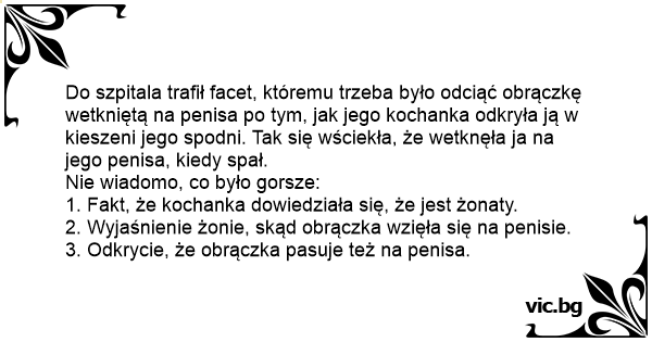 Do szpitala trafił facet, któremu trzeba było odciąć obrączkę wetkniętą na penisa po tym, jak jego kochanka odkryła ją w kieszeni jego spodni. Tak się wściekła, że wetknęła ja na jego penisa, kiedy spał.