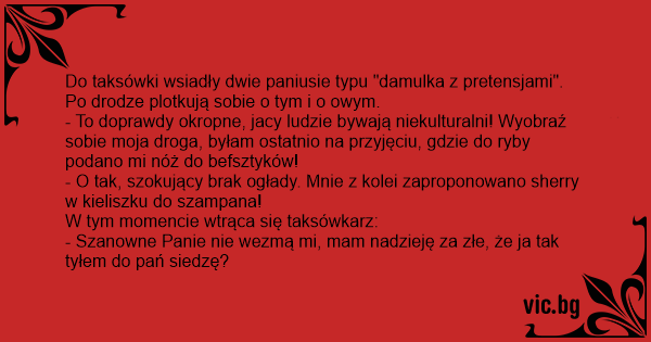 Do taksówki wsiadły dwie paniusie typu "damulka z pretensjami".
