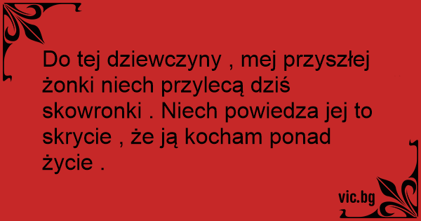 Do tej dziewczyny , mej przyszłej żonki niech przylecą dziś skowronki . Niech powiedza jej to skrycie , że ją kocham ponad życie .