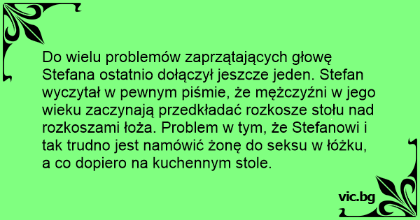 Do wielu problemów zaprzątających głowę Stefana ostatnio dołączył jeszcze jeden. Stefan wyczytał w pewnym piśmie, że mężczyźni w jego wieku zaczynają przedkładać rozkosze stołu nаd rozkoszami łoża. Problem w tym, że Stefanowi i tak trudno jest namówić żonę do seksu w łóżku, a co dopiero na kuchennym stole.