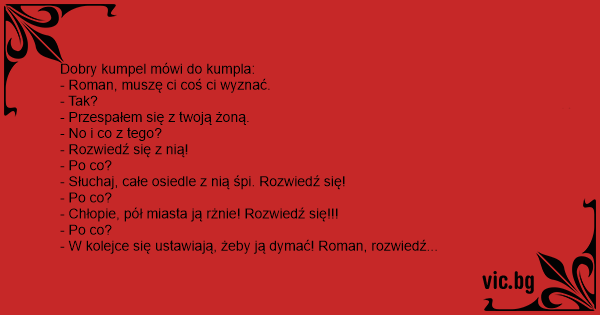 - Chłopie, pół miasta ją rżnie! Rozwiedź się!!!