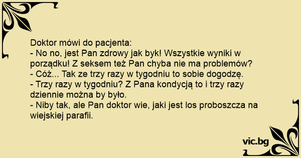 - No no, jest Pan zdrowy jak byk! Wszystkie wyniki w porządku! Z seksem też Pan chyba nie ma problemów?