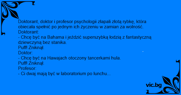 Doktorant, doktor i profesor psychologii złapali złotą rybkę, która obiecała spełnić po jednym ich życzeniu w zamian za wolność.