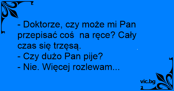 Egy pasi bemegy a dokihoz, mert nagyon remeg a keze. - Mondja uram, Ön sokat iszik? - kérdezi a doki. - Hát..., szeretnék, de állandóan kilötyögtetem!
