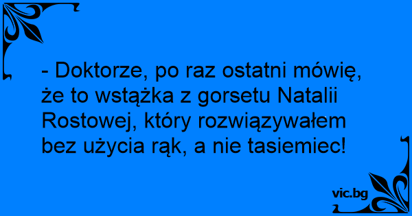 - Doktorze, po raz ostatni mówię, że to wstążka z gorsetu Natalii Rostowej, który rozwiązywałem bez użycia rąk, a nie tasiemiec!