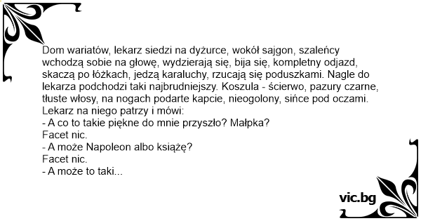 Dom wariatów, lekarz siedzi na dyżurce, wokół sajgon, szaleńcy wchodzą sobie na głowę, wydzierają się, bija się, kompletny odjazd, skaczą po łóżkach, jedzą karaluchy, rzucają się poduszkami. Nagle do lekarza podchodzi taki najbrudniejszy. Koszula - ścierwo, pazury czarne, tłuste włosy, na nogach podarte kapcie, nieogolony, sińce pod oczami. Lekarz na niego patrzy i mówi: