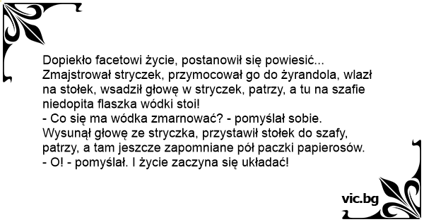 Zmajstrował stryczek, przymocował go do żyrandola, wlazł na stołek, wsadził głowę w stryczek, patrzy, a tu na szafie niedopita flaszka wódki stoi!