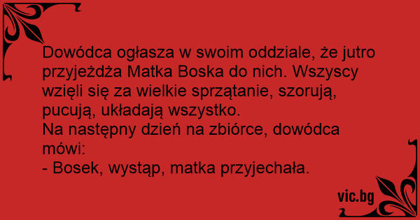 Dowódca ogłasza w swoim oddziale, że jutro przyjeżdża Matka Boska do nich. Wszyscy wzięli się za wielkie sprzątanie, szorują, pucują, układają wszystko.