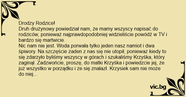 Druh drużynowy powiedział nam, że mamy wszyscy napisać do rodziców, ponieważ najprawdopodobniej widzieliście powódź w TV i bardzo się martwicie.