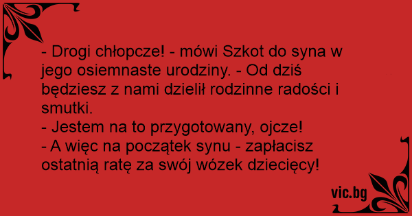 - Drogi chłopcze! - mówi Szkot do syna w jego osiemnaste urodziny. - Od dziś będziesz z nami dzielił rodzinne radości i smutki.