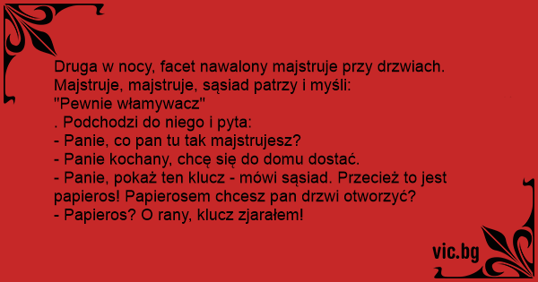 - Panie, pokaż ten klucz - mówi sąsiad. Przecież to jest papieros! Papierosem chcesz pan drzwi otworzyć?