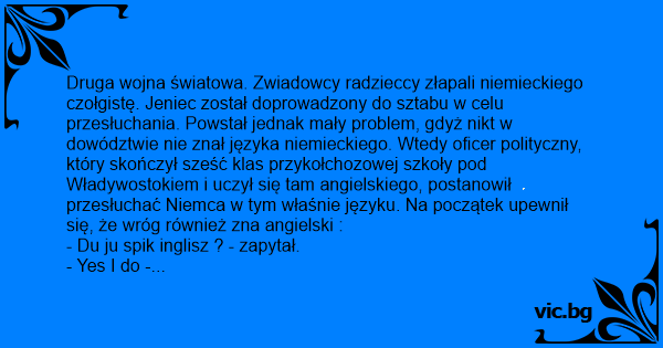 Druga wojna światowa. Zwiadowcy radzieccy złapali niemieckiego czołgistę. Jeniec został doprowadzony do sztabu w celu przesłuchania. Powstał jednak mały problem, gdyż nikt w dowództwie nie znał języka niemieckiego. Wtedy oficer polityczny, który skończył sześć klas przykołchozowej szkoły pod Władywostokiem i uczył się tam angielskiego, postanowił przesłuchać Niemca w tym właśnie języku. Na początek upewnił się, że wróg również zna angielski :