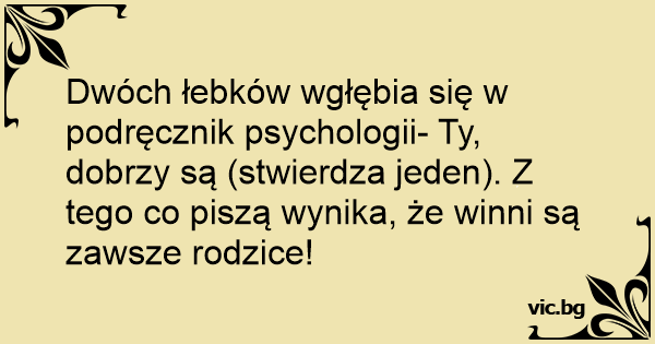 Dwóch łebków wgłębia się w podręcznik psychologii- Ty, dobrzy są (stwierdza jeden). Z tego co piszą wynika, że winni są zawsze rodzice!