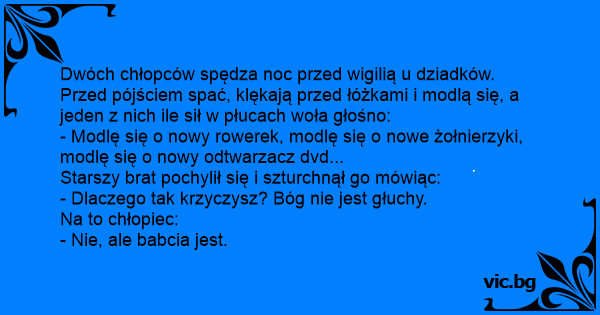 Dwóch chłopców spędza noc przed wigilią u dziadków. Przed pójściem spać, klękają przed łóżkami i modlą się, a jeden z nich ile sił w płucach woła głośno: