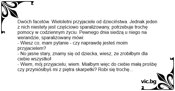 - Wiem, mój przyjacielu, wiem. Miałbym więc do ciebie małą prośbę czy przyniósłbyś mi z piętra skarpetki? Robi się trochę chłodno, a jak wiesz, ja nie jestem w stanie tego zrobić.