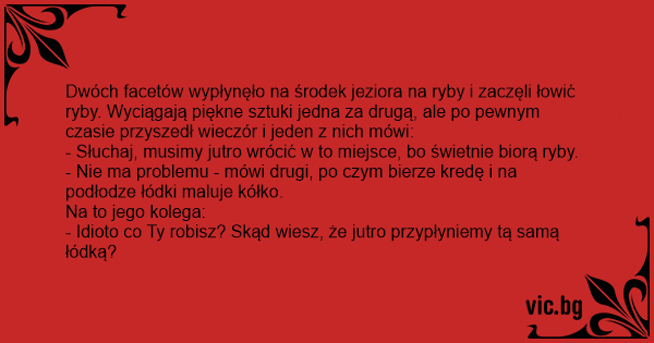 Dwóch facetów wypłynęło na środek jeziora na ryby i zaczęli łowić ryby. Wyciągają piękne sztuki jedna za drugą, ale po pewnym czasie przyszedł wieczór i jeden z nich mówi: