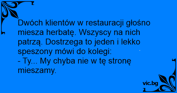Dwóch klientów w restauracji głośno miesza herbatę. Wszyscy na nich patrzą. Dostrzega to jeden i lekko speszony mówi do kolegi:
