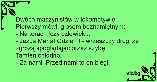 Dwóch maszynistów w lokomotywie. Pierwszy mówi, głosem beznamiętnym: