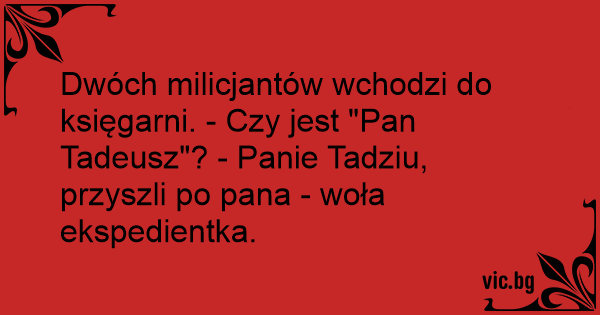 Dwóch milicjantów wchodzi do księgarni. - Czy jest "Pan Tadeusz"? - Panie Tadziu, przyszli po pana - woła ekspedientka.