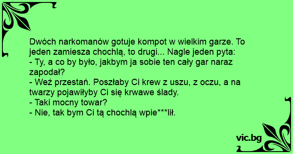Dwóch narkomanów gotuje kompot w wielkim garze. To jeden zamiesza chochlą, to drugi... Nagle jeden pyta: