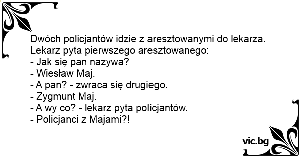 Dwóch policjantów idzie z aresztowanymi do lekarza. Lekarz pyta pierwszego aresztowanego: