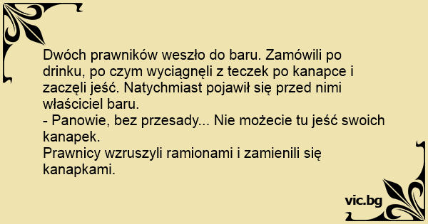 Két ügyvéd bemegy egy étterembe, leülnek, kérnek egy pohár vizet, majd kinyitják az aktatáskájukat és elővesznek 1-1 szendvicset. A pincér felháborodva odaszól: - De uraim! Ez egy étterem! Itt nem...