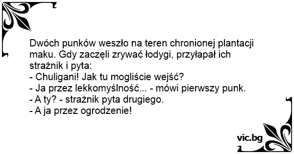 Dwóch punków weszło na teren chronionej plantacji maku. Gdy zaczęli zrywać łodygi, przyłapał ich strażnik i pyta: