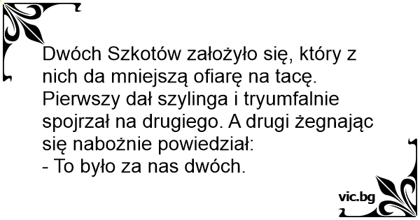 Dwóch Szkotów założyło się, który z nich da mniejszą ofiarę na tacę. Pierwszy dał szylinga i tryumfalnie spojrzał na drugiego. A drugi żegnając się nabożnie powiedział: